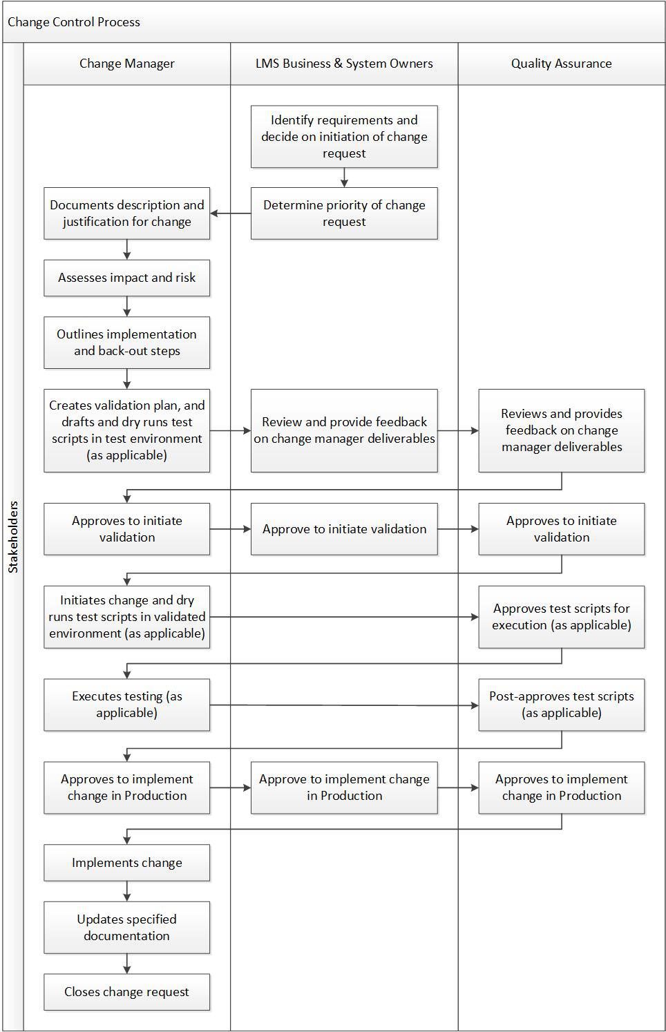 There should be several roles involved in the change control process, including the change manager, the LMS business and system owners, and the quality assurance team, to maintain proper system oversight. The change manager is responsible for driving the change request through the process from beginning to end, but it is a collaborative effort involving feedback from and coordination between all roles until the change is implemented in Production. The chart below outlines the main responsibilities of each role throughout the process workflow: